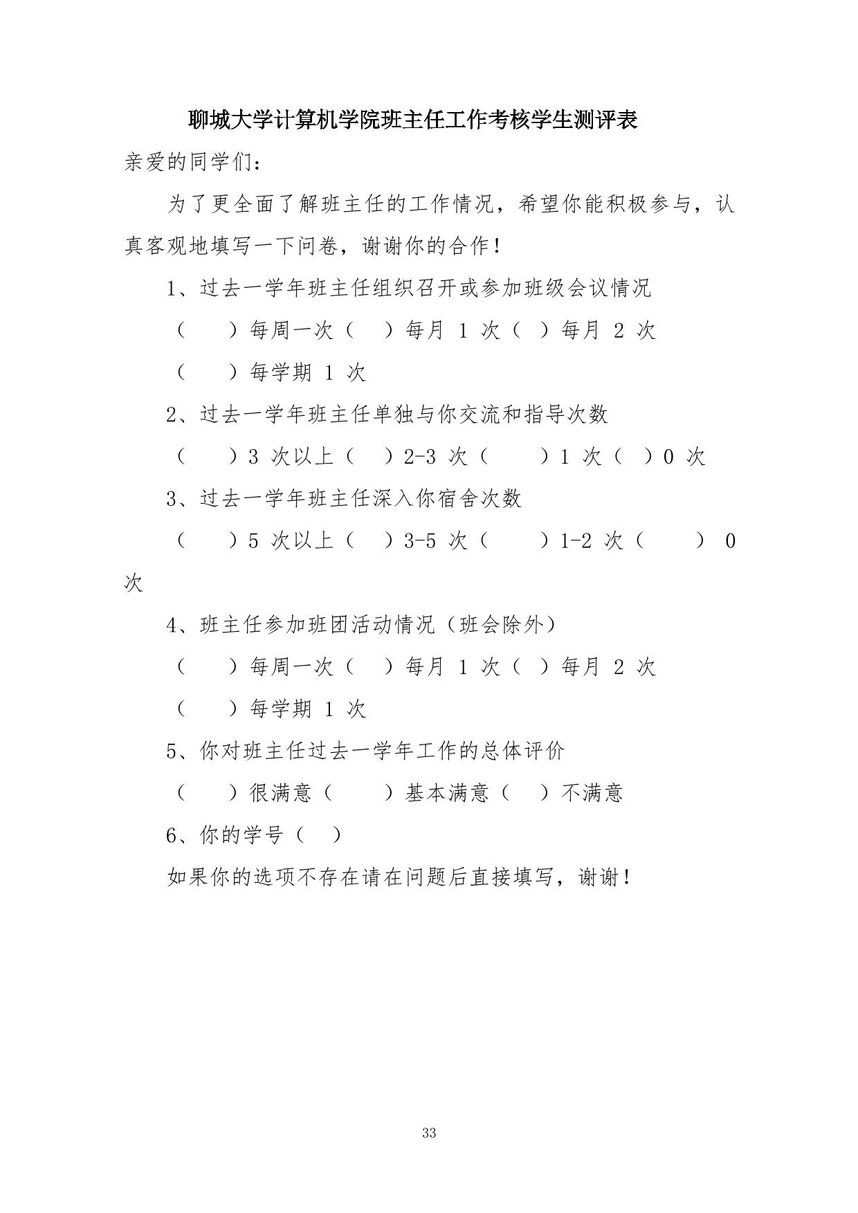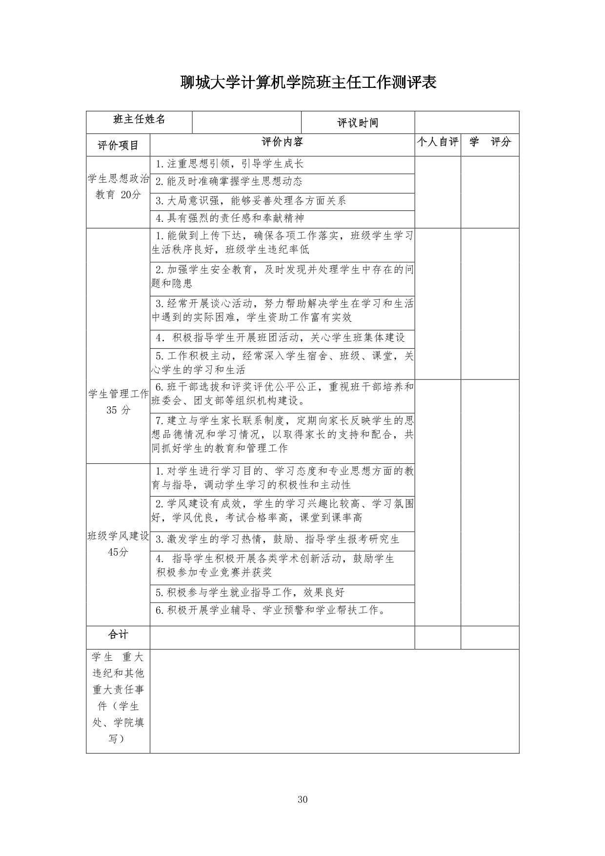 2、班主任工作考核主要根据基础工作和工作实绩情况,从德、能、勤、绩、廉等方面进行综合考核。班主任本人填写《jinnianhui今年会班主任工作测评表》(见附件),班主任考核工作小组结合《今年会jinnianhui金字招牌班主任工作测评表》和《今年会jinnianhui金字招牌班主任工作考核学生测评表》(见附件)综合评定。