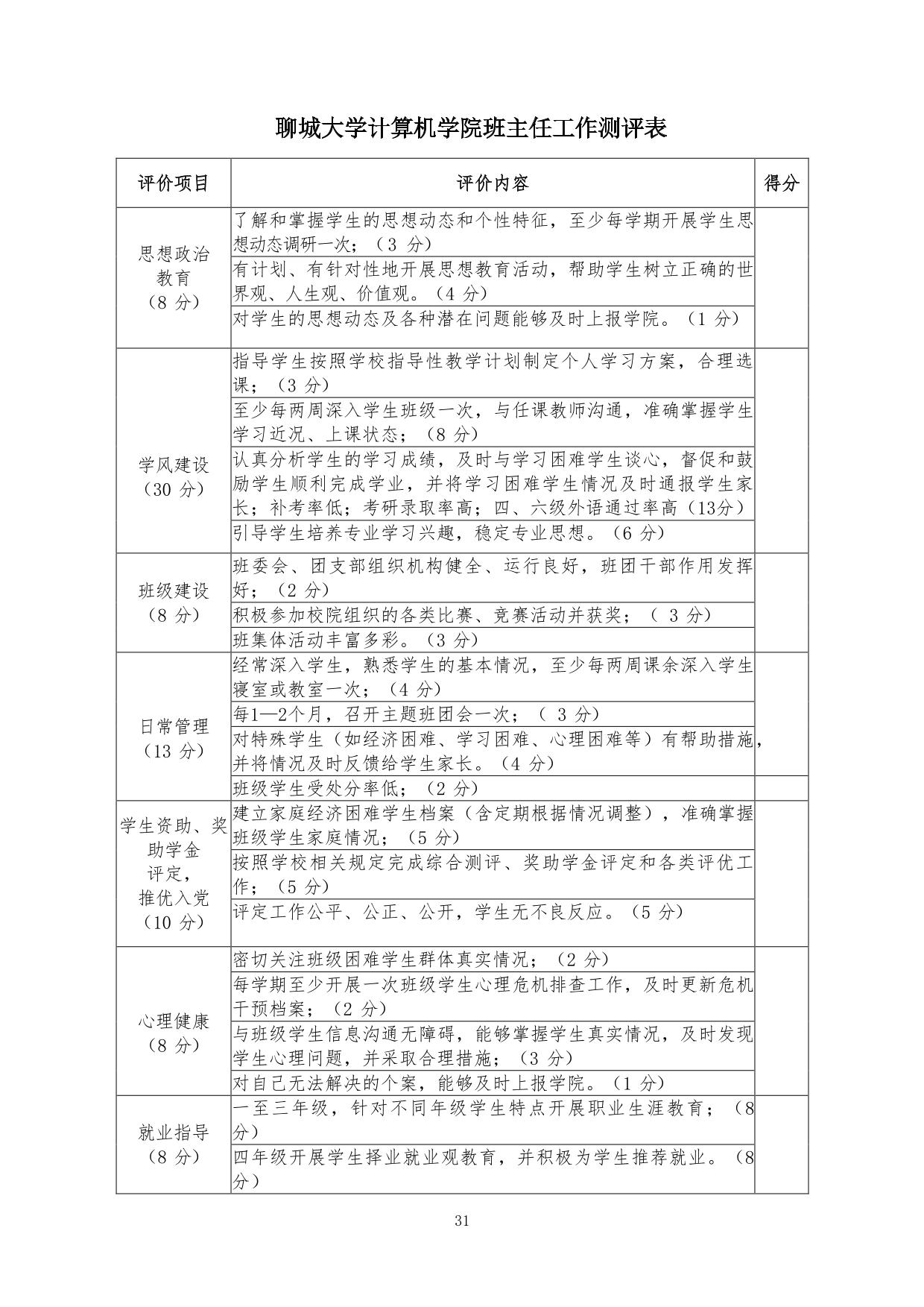 2、班主任考核应坚持基础工作与工作实绩相结合、定性考核与定量考核相结合的原则,公开、公正、公平地对班主任工作进行全面、客观、科学的评价。