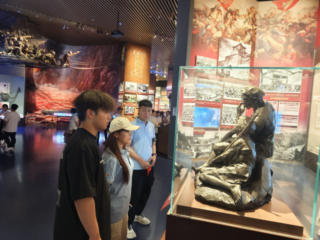 踏入展馆,巨幅漆壁画《长城颂》以万山红遍之势铺展,既象征革命先烈用血肉铸就的精神长城,也诠释"江山就是人民"的深刻内涵。实践队员凝视画作,深切感悟和平生活的来之不易。前行中,百年党史画卷徐徐展开。中共一大会址复原场景里,煤油灯映照先驱探索真理的坚定;红军长征展品静默陈列,诉说着革命先辈为民族独立而战的壮阔征程。这些承载信仰与奉献的展品,化作穿越时空的精神力量,让队员们既震撼于先辈的英勇,又感动于信念的坚韧。