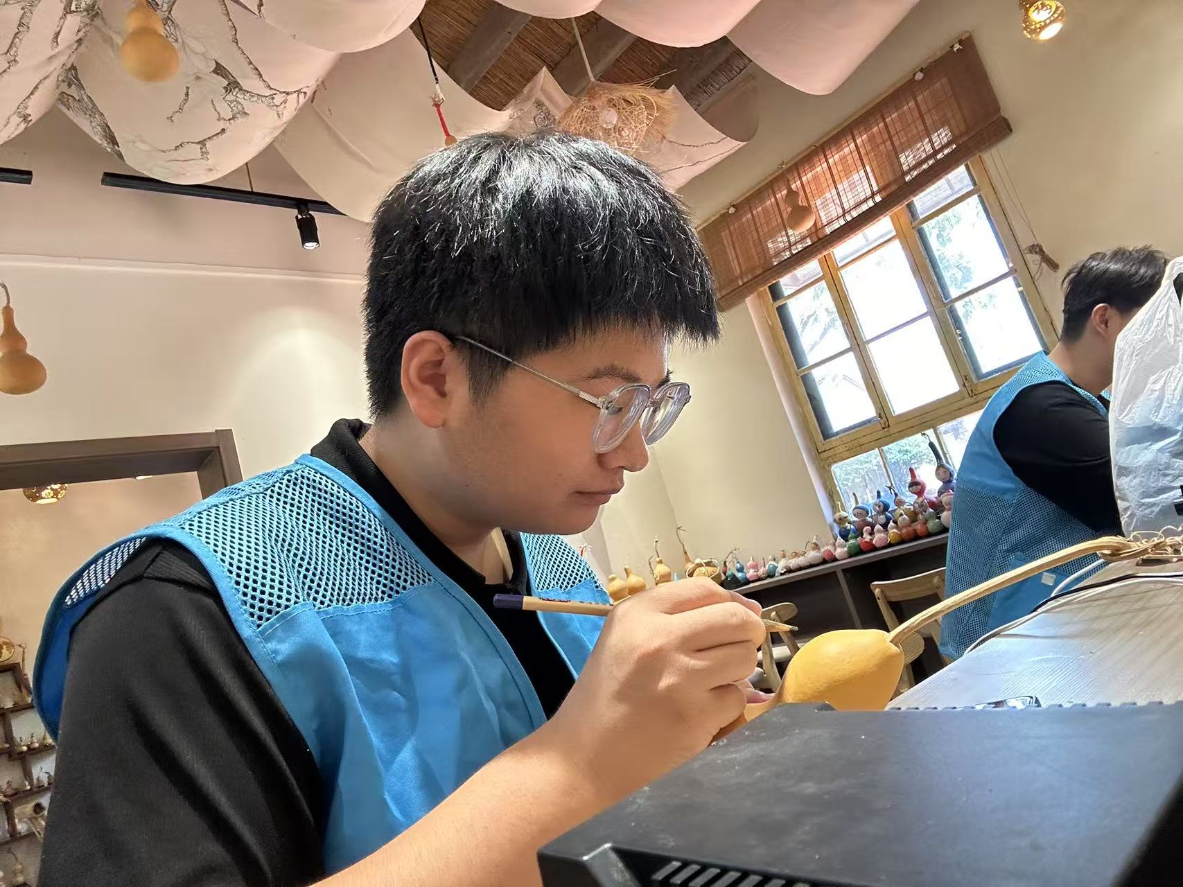 7月7日,实践队深入国家级非遗传承人李勇的工作室。李勇展示了家族传承的老照片,并分享其学艺历程:“我自幼跟随父亲学习手艺,初期刻损的葫芦不下百个。父亲教导我,‘葫芦自有灵性,需顺应其天然纹路而行’。”工作室陈列架上,展示着李勇不同时期的代表作品:早期以传统“福”“寿”纹样为主,近年则创作出“水浒人物”“聊城古城”等富含地方文化特色的作品。李勇现场演示了“针刻”与“刀刻”技法的区别:“针刻以钢针勾勒线条,适于表现细腻的人物面部;刀刻则用平刀铲刻,更宜呈现大面积的山水背景。”他特别介绍了一把使用逾二十年的刻刀:“此刀刃宽仅0.3毫米,需每日精心擦拭保养。”