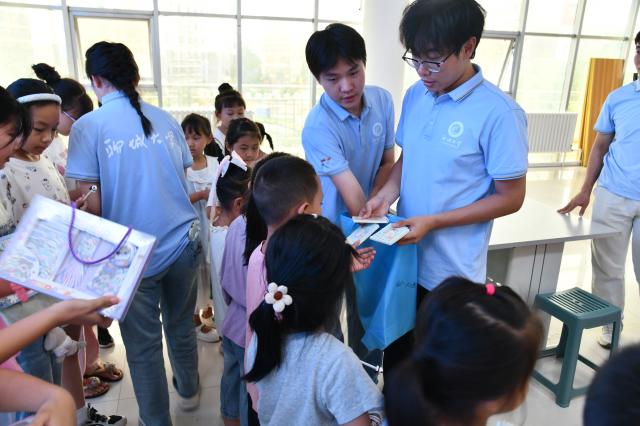 志愿者组织孩子们分享在七彩假期中的所有收获:破冰环节中设计绘满家乡元素的DIY姓名牌、亲手制作的“情绪魔法瓶”以及利用Scratch编程软件创作出的“会跳舞的小动物”作品,这些生动具体的成果,不仅仅是手工和代码的结晶,更是孩子们在社交融入、情绪管理、逻辑思维、问题解决和创新实践能力上悄然绽放的成长之花,清晰地记录了他们在这个七彩假期中自信、友爱与能力的全面提升。志愿者们为孩子们颁发了精心准备的奖品,以表彰他们在活动中的出色表现,鼓励他们继续在编程和艺术的道路上勇敢探索,追求卓越。在颁发完奖品后,内蒙古自治区乌海市白楼社区党委书记徐廷清为jinnianhui今年会社会实践基地隆重揭牌,这标志着双方在推动社区教育与科技融合合作上迈出了重要的一步,进一步加深了校地合作的深度与广度。徐廷清在本次活动的闭幕仪式上致辞,对参与此次社会实践活动的聊大青年学子表达了高度的赞赏和殷切的期望。他鼓励大家要持续关注社区发展,积极参与到社区建设中去,将所学的知识和专业技能与社区实际需求相结合,勇于探索,敢于创新,为社区的进步与发展贡献青春的智慧和力量。