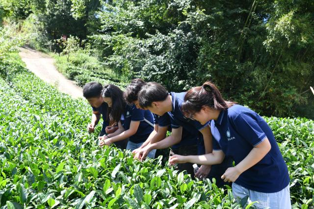 实践服务队沿着小镇旁的生态步道漫步,近距离观察金桥村农作物的生长状态,远眺连片的生态茶园与峡谷景观,直观感受金桥村红色文化融合乡村振兴的多元发展格局,为后续结合专业提出数智化建议收集更多鲜活素材。队员们主动上前与农户交谈,询问茶叶、手工辣酱等产品的生产销售情况,了解“政府+村集体+企业+农户”持股模式下,村民的收入变化与参与产业发展的积极性。当地茶农为队员们演示了采茶的要领:“一芽一叶是标准,手法要轻,动作要快。”实践队员纷纷参与采茶实践,起初他们手法尚显生疏,指尖在茶丛间略显迟疑,不时需要向身旁的茶农请教采摘的诀窍。经过反复练习与实践,逐渐领悟到“一芽一叶”的精髓,动作由生涩转为流畅,采摘的节奏也愈发娴熟自如。实践队员用脚步丈量乡村土地、用双手触摸农业生产,深刻体会到茶农的辛劳,也对金桥村的茶产业有了更直观的认识,实现了从“知”到“行”的成长跨越。