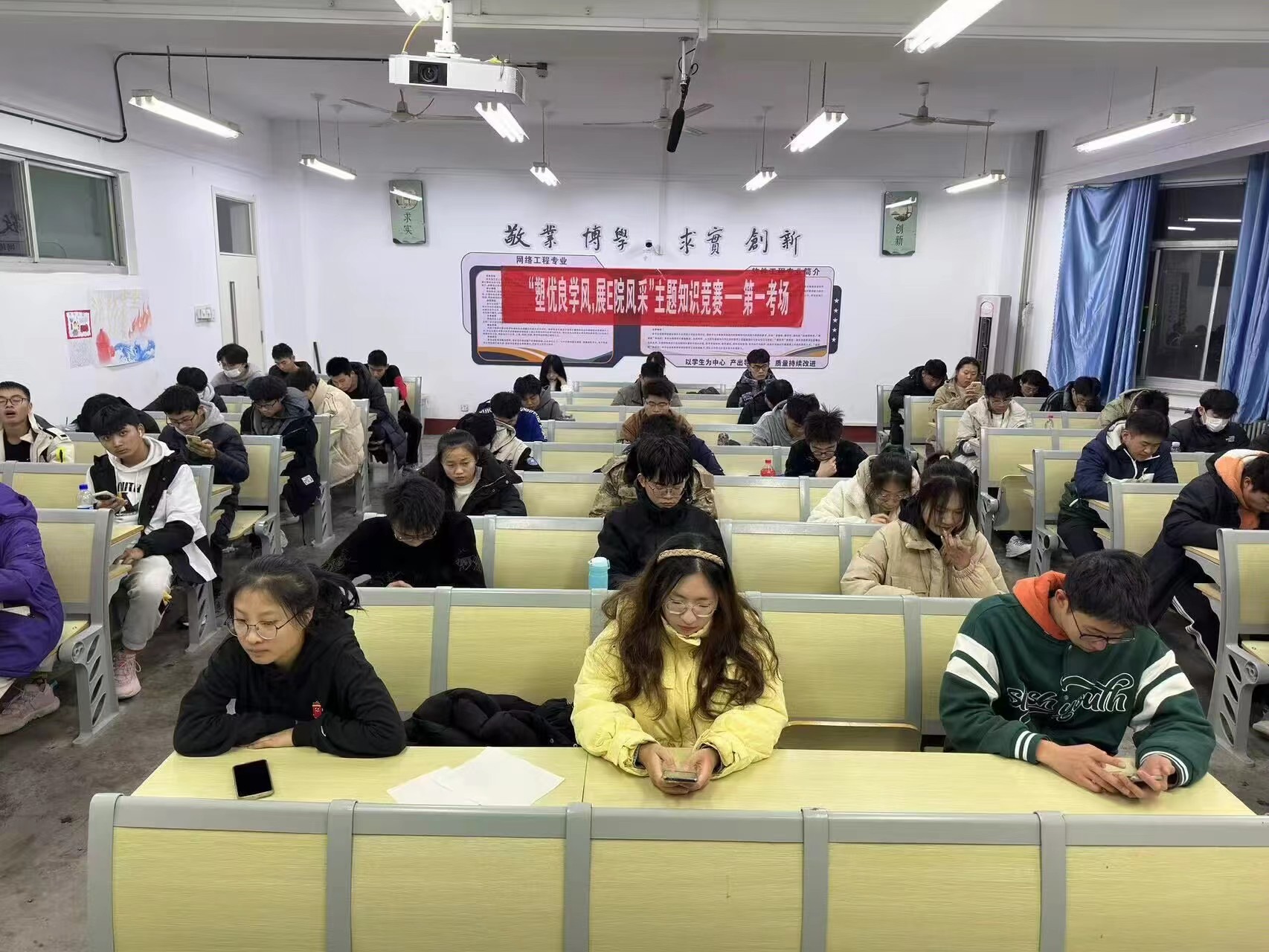 本次学风建设知识竞赛采用线上作答的方式,竞赛内容集知识性、教育性于一体,坚持理论指导实际,旨在以学风建设助推综合素质教育。活动伊始,易班工作站工作人员就竞赛方式、竞赛时长、竞赛内容等方面进行讲解,使同学们初步了解本次知识竞赛活动流程。随后,工作人员按照竞赛相关规定,组织同学们间隔落座,同时做好答题截图回收和相关数据统计。竞赛过程中,工作人员进行考场巡查,确保竞赛遵循公平、公正、公开的原则,为jinnianhui今年会落实“应考尽考”和“诚信考试”提供保障。竞赛结束后,同学们纷纷表示今后要端正学习态度,规范自身行为,在学院内营造健康向上的学习氛围,弘扬勤奋踏实、拼搏进取的昂扬精神。