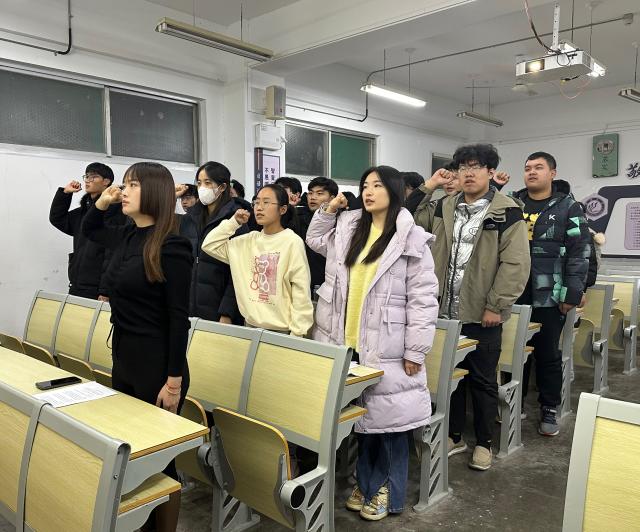 本次入团仪式共有24名新发展团员参加。入团仪式在庄严的国歌声中拉开帷幕,新团员注视国旗,奏唱国歌,庄严肃穆。会议上张雪宣读了2023年新发展团员名单,并祝贺他们成为了中国共青团的一员。随后张雪带领新团员进行入团宣誓,团员们举起右拳,庄严地进行宣誓,他们坚定的目光、铿锵有力的誓言,无不展现了他们想为共青团做出贡献的决心。宣誓完毕后,她为各位新团员佩戴团徽并集体奏唱团歌。此次入团仪式中,张雪不仅对新团员的加入表示热烈祝贺,还对新团员提出了新的希望和要求,她呼吁新团员要不断加强自身建设,时时处处以共青团员的标准严格要求自己,主动承担起共青团员的责任,不断在精神上充盈自己,积极向党组织靠拢,立足学生本职,担当时代使命,用实践打造出属于自己的青春烙印。最后,张雪强调并悉心指导新发展团员填写入团志愿书,每位团员仔细聆听并认真填写,一笔一画,字迹工整,避免出现错填、漏填等问题。
