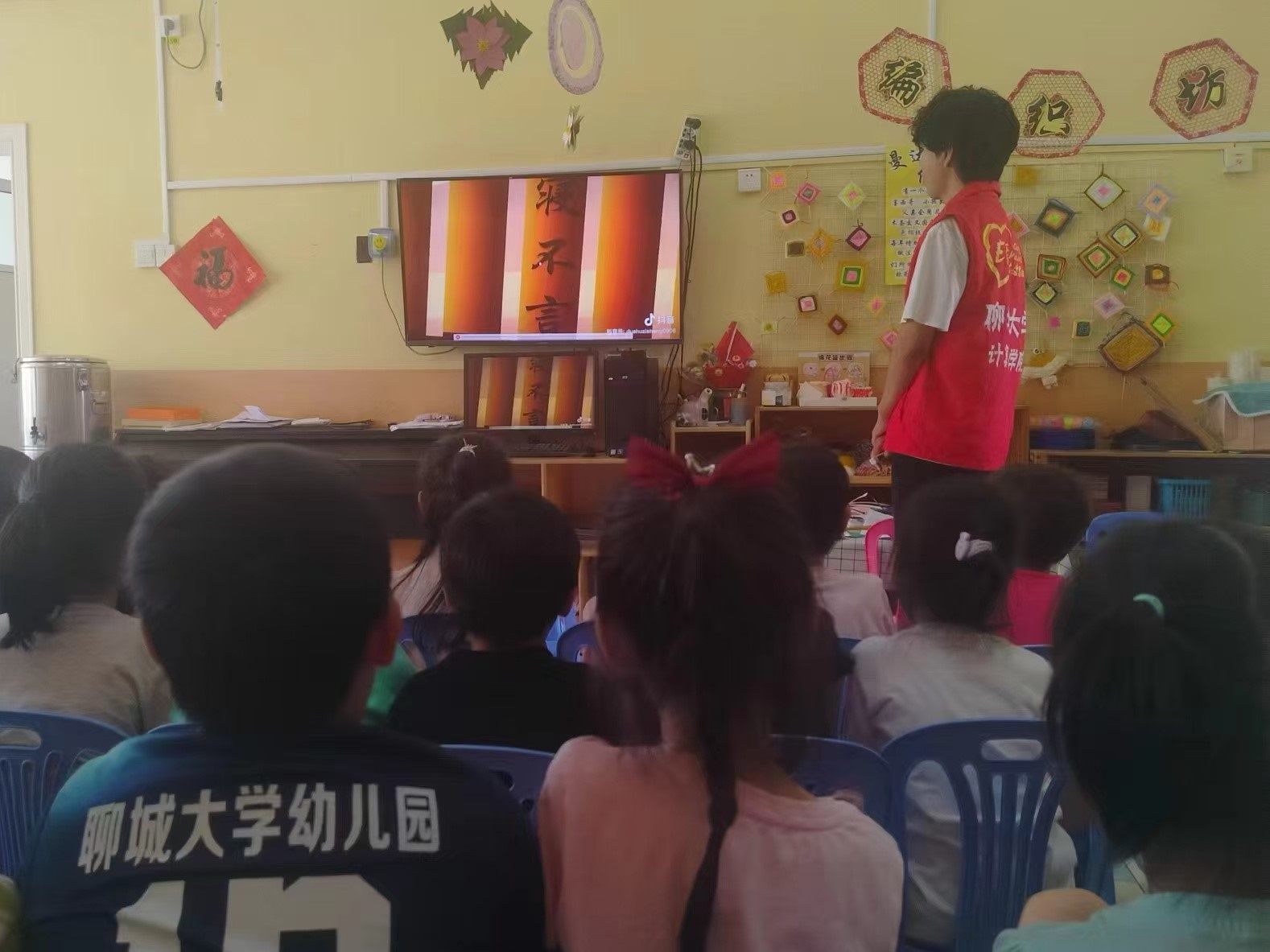 追寻红色足迹,弘扬历史使命。7月10日,志愿者们开展红色文化宣讲活动,向小朋友们讲述红色故事。在讲述过程中,志愿者们用丰富的肢体语言、生动的表情,讲述了《刘胡兰》、《狼牙山五壮士》等革命先辈们不怕流血牺牲、催人奋进的红色英勇故事。一段段壮丽的红色历史篇章,犹如一幅幅动人的画卷呈现在眼前。一个故事就是一段红色的记忆。小朋友们被扣人心弦的故事深深吸引,不时发出惊叹声和欢笑声。在欢笑声中,活动逐渐接近尾声。