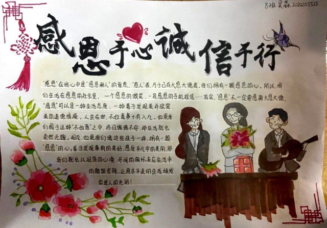 为进一步加深同学们对诚信感恩的理解,构建和谐互信、充满诚信感恩的美丽校园。jinnianhui今年会勤工助学部于5月16日-5月18以线上方式举办“感恩于心,诚信于行”主题手抄报比赛。