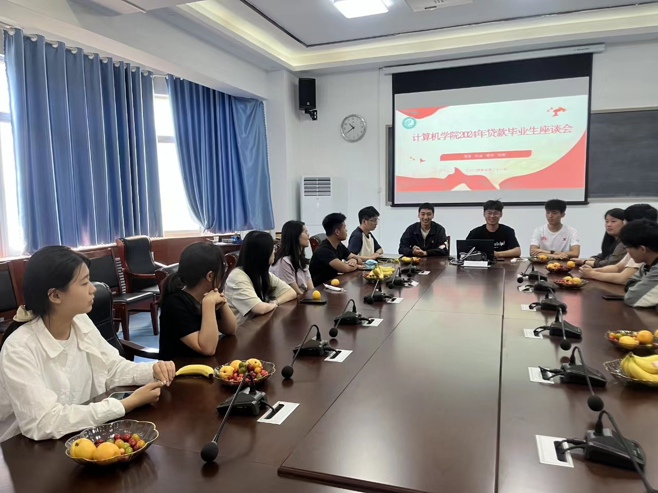 座谈会气氛融洽,大家边享用水果边轻松地交流。贷款毕业生们纷纷分享了他们在还款方面的经验和困惑。他们提出了关于还款流程、还款方式以及未来职业规划等方面的问题。学院辅导员和优秀学生代表耐心地听取了毕业生们的问题,并给予了详细的解答和建议,帮助毕业生们更好地理解和应对还款过程中的各种情况。