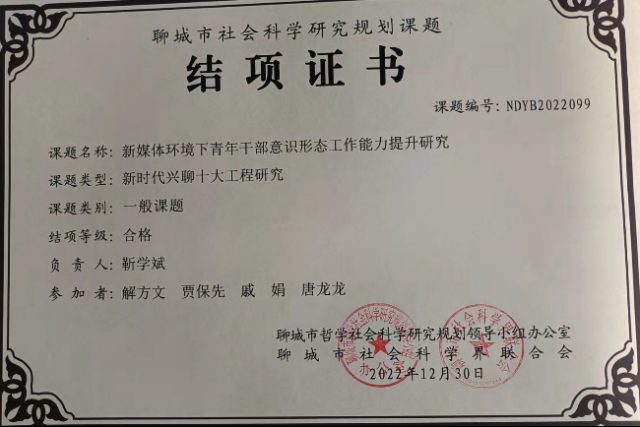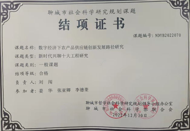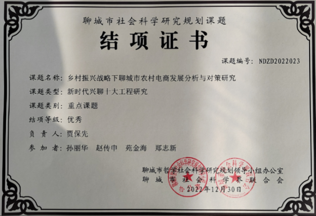 近日,聊城市哲学社会科学研究规划领导小组办公室、聊城市社科联组织召开了2022年度聊城市社会科学研究课题结项评审会议,我院教师承担的《乡村振兴战略下聊城市农村电商发展分析与对策研究》重点课题获评结题“优秀”等级,获得经费支持;《数字经济下农产品供应链创新发展路径研究》、《新媒体环境下青年干部意识形态工作能力提升研究》两项课题获评结题“合格”等级。