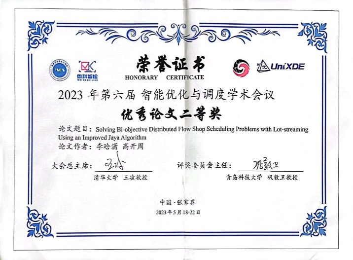近日,我院高开周老师课题组最新研究成果《An Improved Artificial Bee Colony Algorithm with Q-learning for Solving Permutation Flow-shop Scheduling Problems》获得第六届智能优化与调度学术会议优秀论文二等奖。该论文第一作者为我院2020级硕士研究生李晗潇,指导老师为高开周博士。我院桑红燕教授作为颁奖嘉宾之一,为获奖者颁奖。