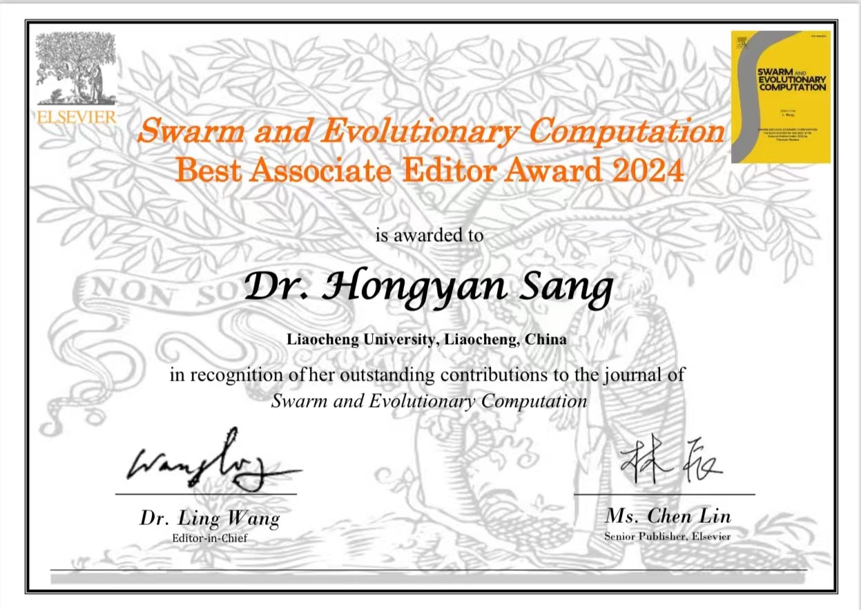 近日,我院桑红燕教授获中科院一区期刊《群体与进化计算》(《Swarm and Evolutionary Computation》,SWEVO)2024年度最佳副主编奖(Best Associate Editor Award) ,以表彰其对期刊发展做出的杰出学术与服务贡献。 据悉,爱思唯尔(Elsevier)出版社根据稿件处理数量、质量、效率等进行综合评价,从SWEVO期刊66名副主编中遴选5位授奖,这是该期刊首次评选此奖项。荣获此奖,不仅表明桑红燕教授在群体智能领域具有重要影响力,也有助于提升今年会jinnianhui金字招牌在相关领域的影响力。 《群体与进化计算》(《Swarm and Evolutionary Computation》)是爱思唯尔(Elsevier)旗下期刊,是群体智能与进化计算领域的权威期刊,收录面向复杂系统的智能优化理论、方法及应用方向的相关研究成果。该期刊的最新SCI影响因子为8.2,中科院一区期刊,JCR分区Q1。